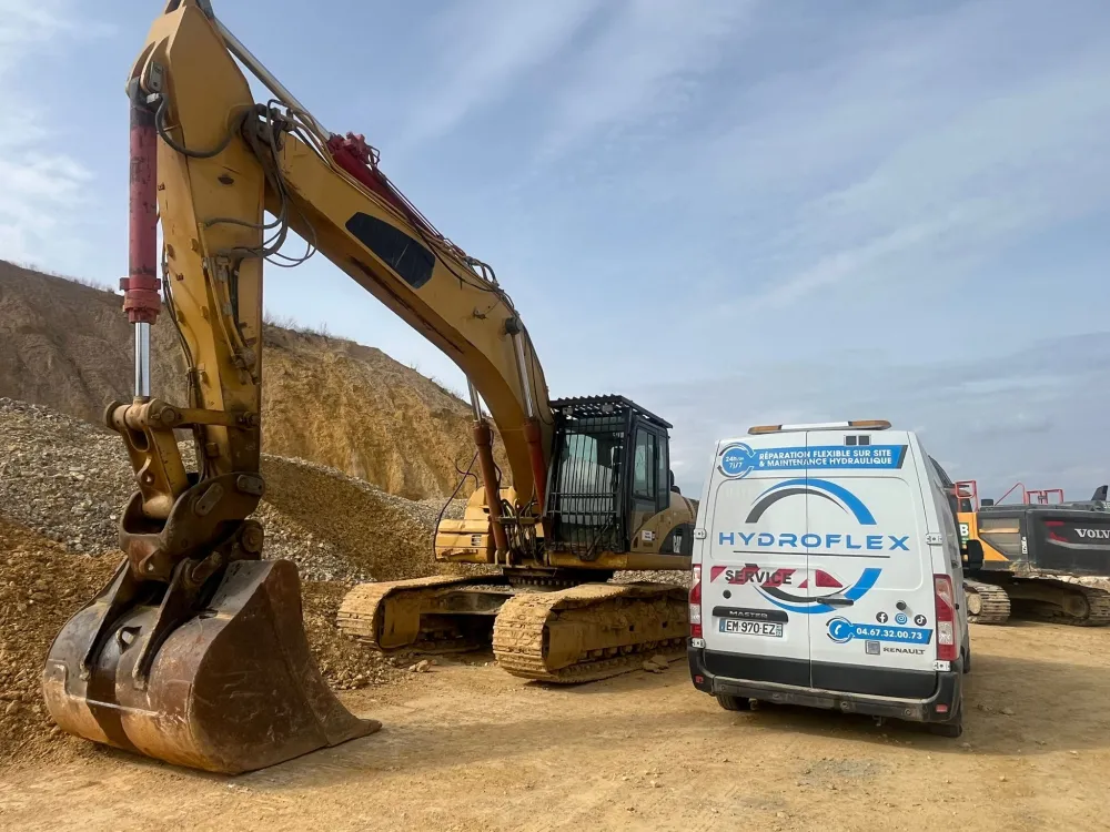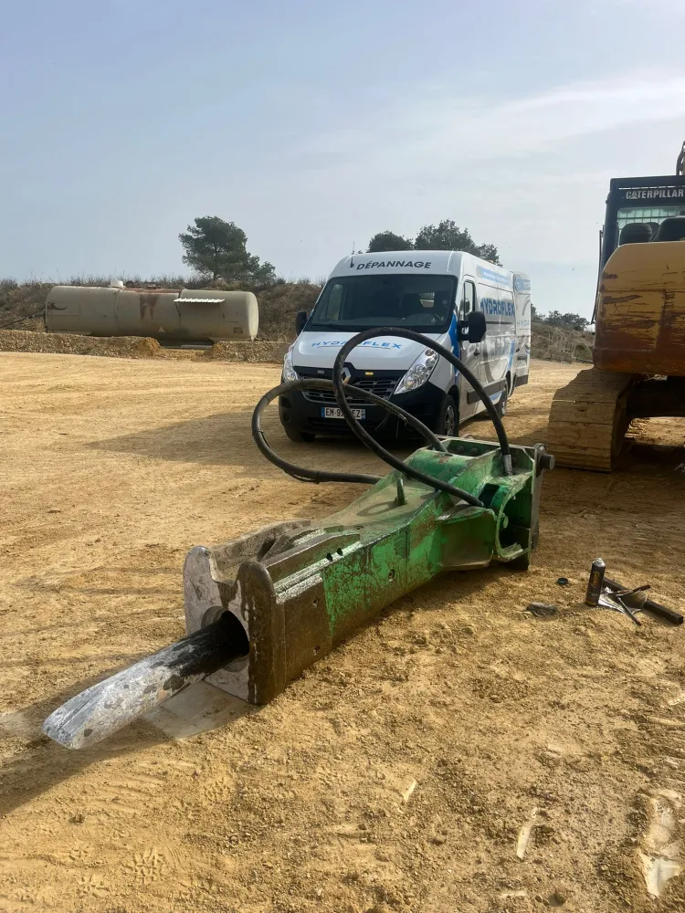 Nos équipes sont intervenues pour le changement d’un flexible de BRH, destiné à être monté sur cette pelle Volvo, afin d’assurer un fonctionnement optimal de l’outil hydraulique et la sécurité des opérateurs sur chantier.