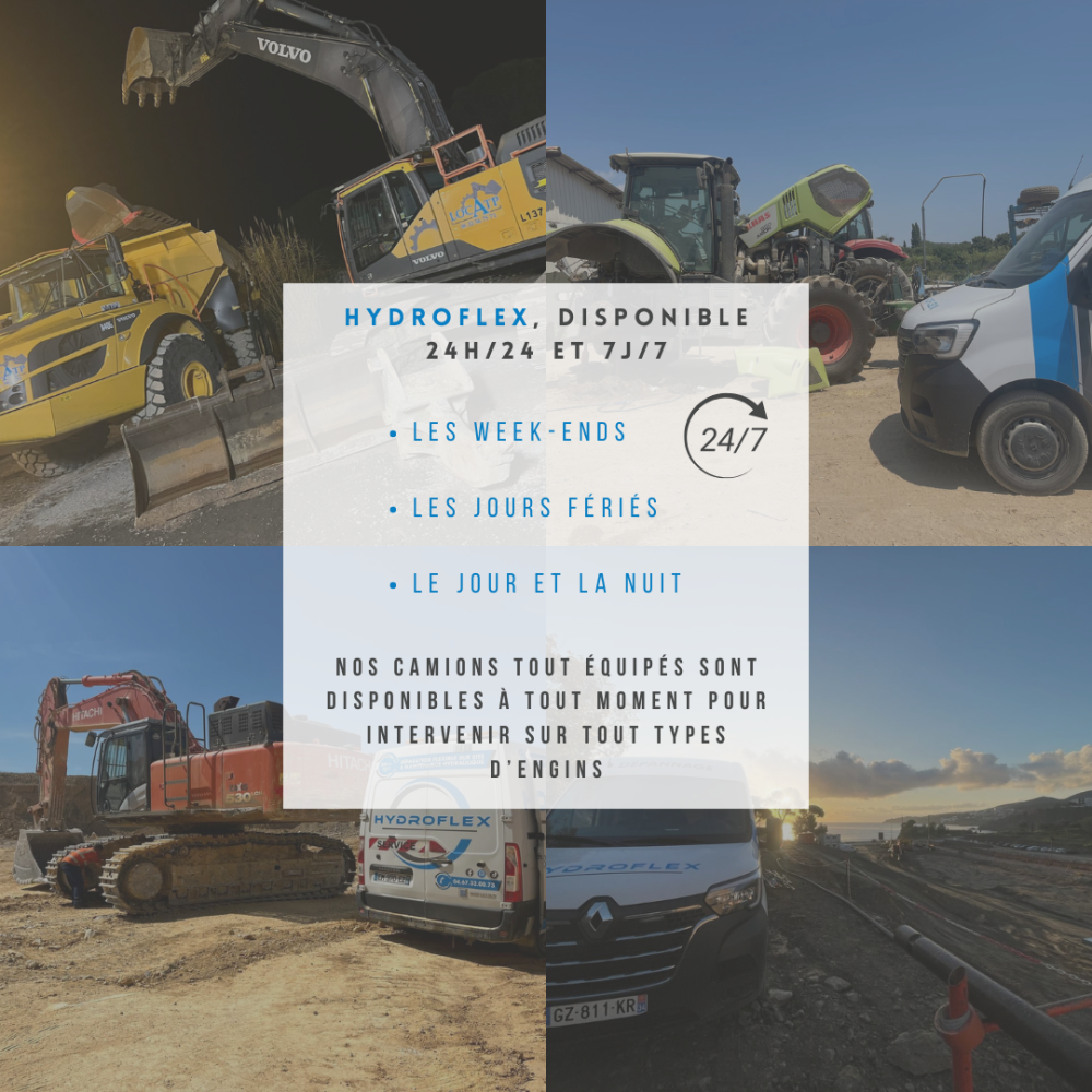 Chez Hydroflex, nous sommes là 24h/24 et 7j/7 pour vous dépanner sur tous types d’engins : pelles, chargeuses, tracteurs, camions, bateaux,..