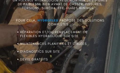 Pour chaque installation hydraulique, HYDROFLEX effectue un contrôle complet des flexibles afin d’anticiper les risques et éviter tout arrêt de machine. Mon service comprend l’inspection des points sensibles, le test de pression et la vérification de l’état des pièces, cela garantit la performance et la sécurité des systèmes hydrauliques, tout en prolongeant la durée de vie de chaque matériel.